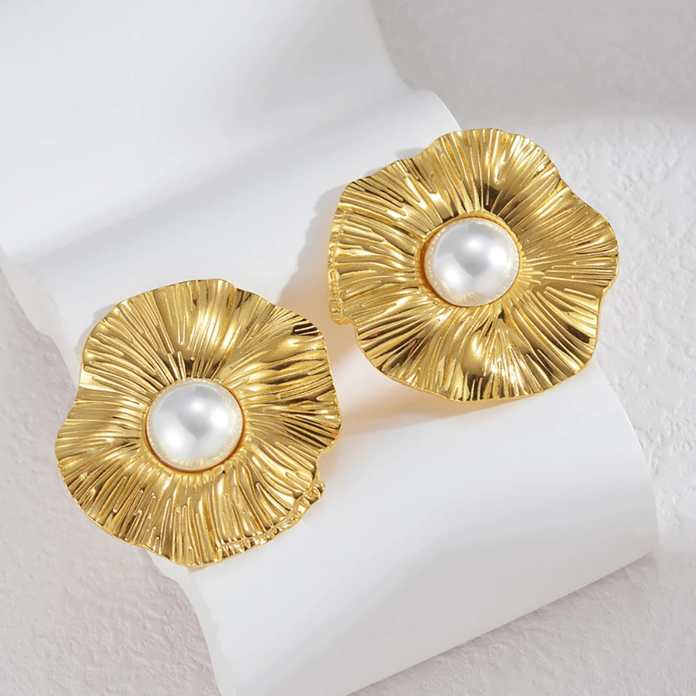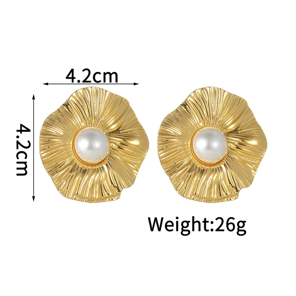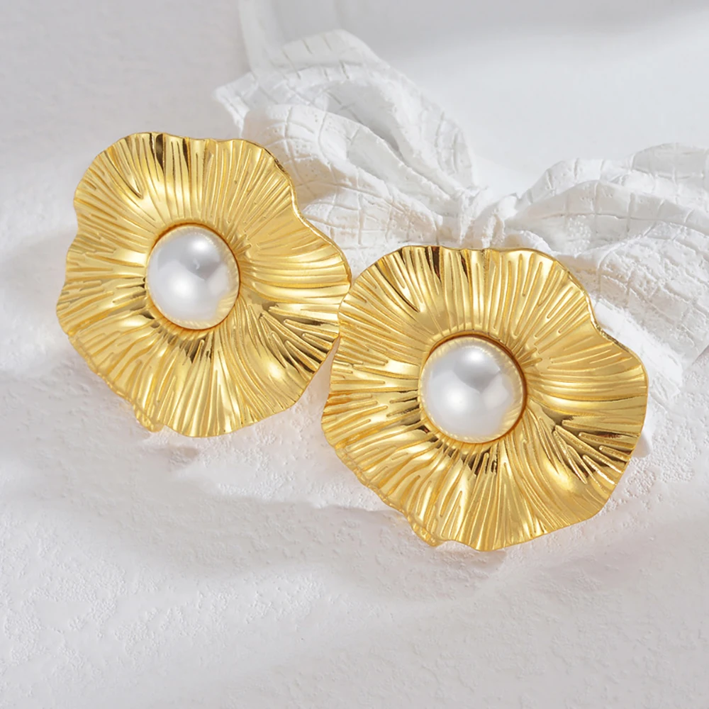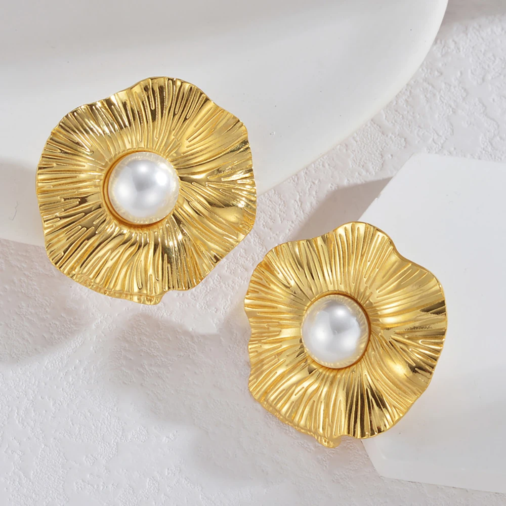 YUKAM Trendy 18K Gold Plated Stainless Steel Irregular Lotus Leaf Petal Sunflower Daisy Flower Big Pearl Stud Earring for Women